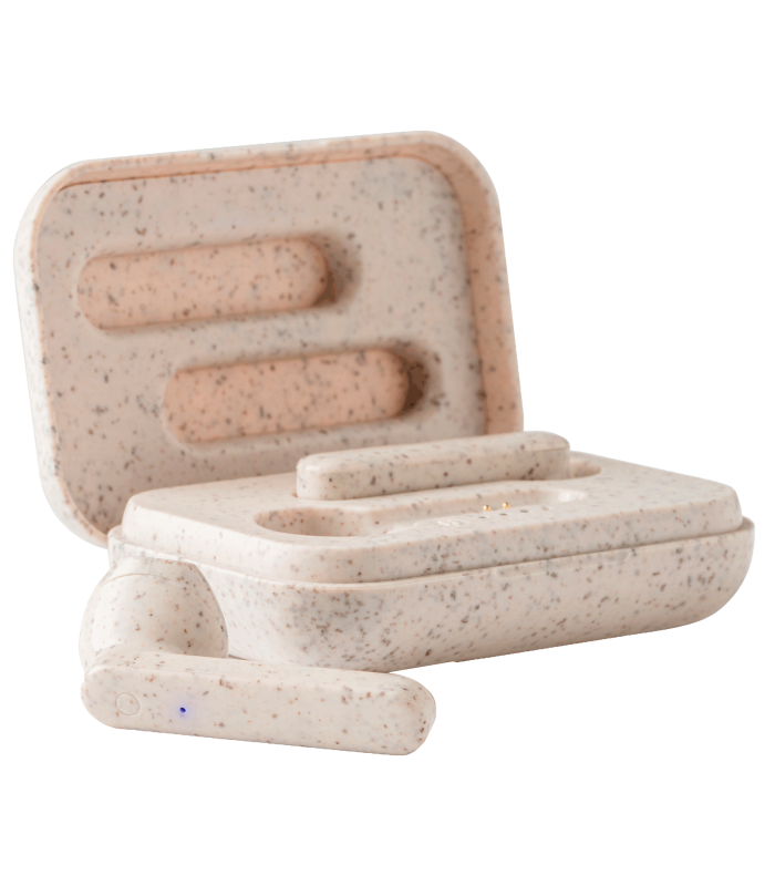 Auriculares inalámbricos de botón fabricados con fibra de trigo, Bluetooth 5.0. Panel de control de tecnología táctil integrado en auricular y función manos libros. Estuche con batería recargable y tapa imantada