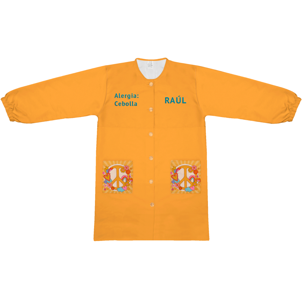 Bata escolar con cierre con botones, dos bolsillos en la parte delantera y goma en los puños