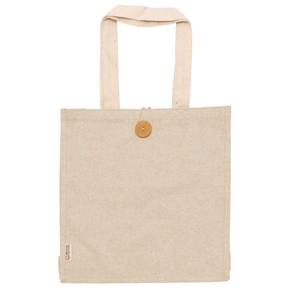 Bolsa de algodón reciclado con acabado jaspeado y un botón como cierre. Asas largas reforzadas de 70 cm