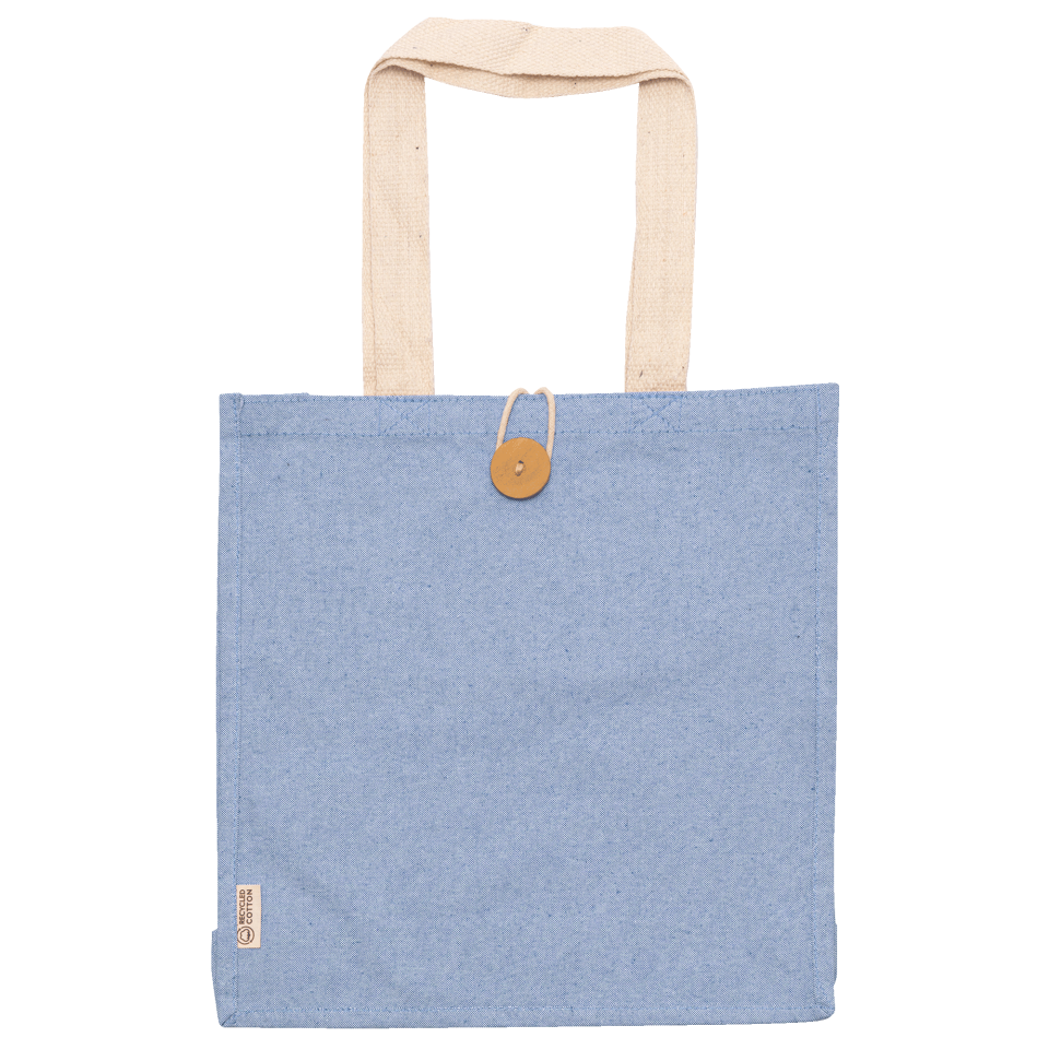 Bolsa de algodón reciclado con acabado jaspeado y un botón como cierre. Asas largas reforzadas de 70 cm