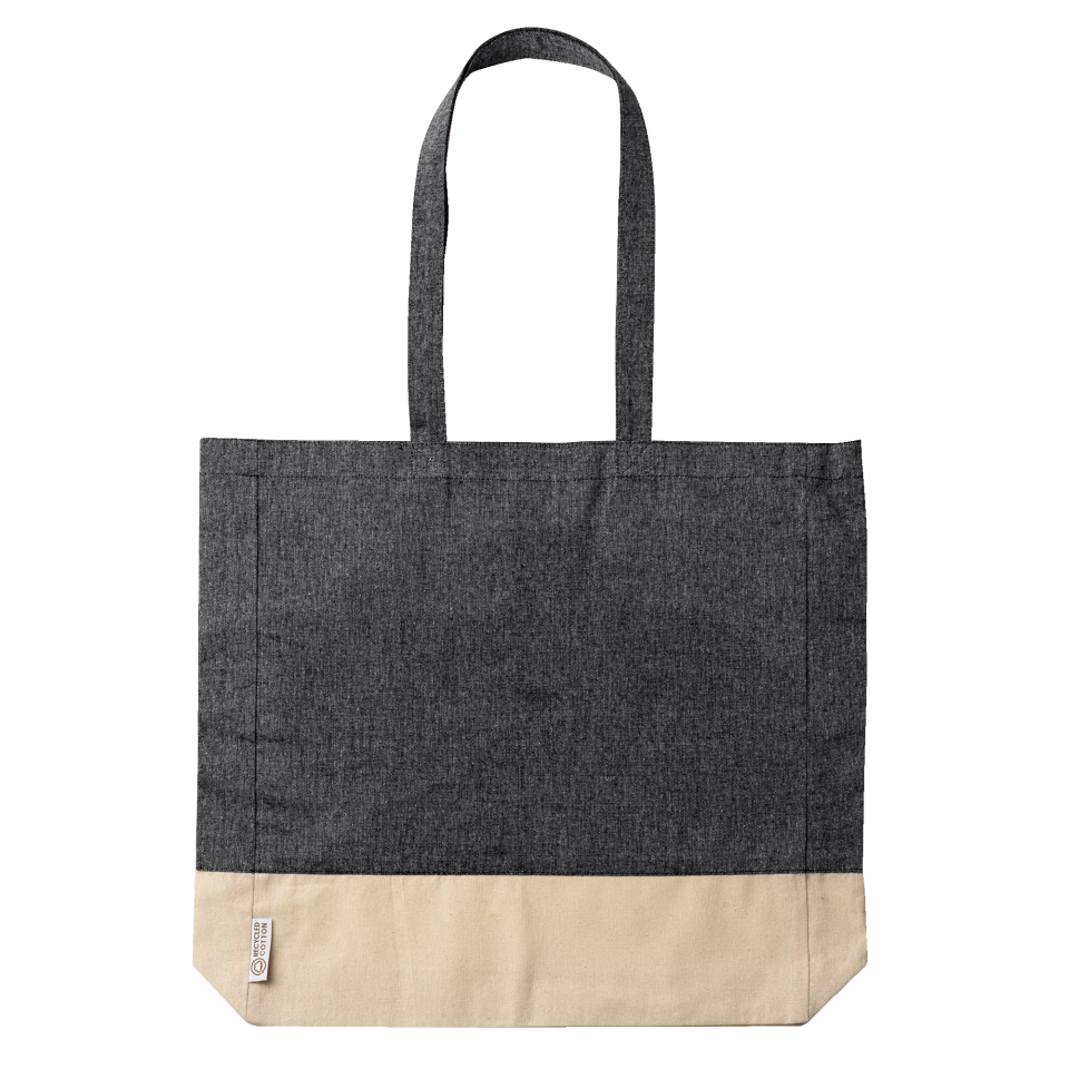 Bolsa bicolor de algodón reciclado con acabado jaspeado y en la parte inferior de algodón natural. Cuenta con asas largas reforzadas de 70 cm