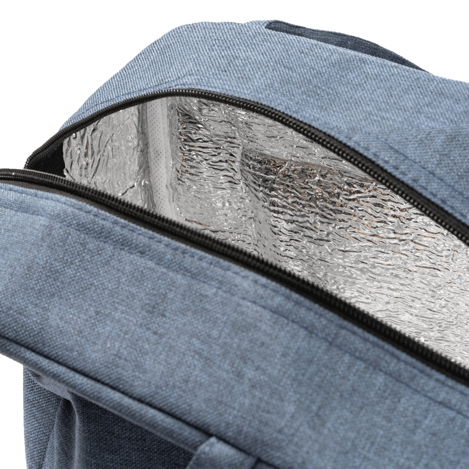 Nevera de RPET 600D que cuenta con asas redondas acolchadas para mayor versatilidad en su transporte