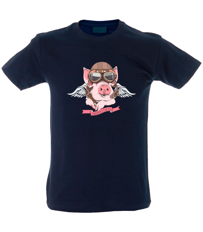 Camiseta hombre de cuello redondo con cinta de refuerzo en el cuello con diseño de cerdito aviador.