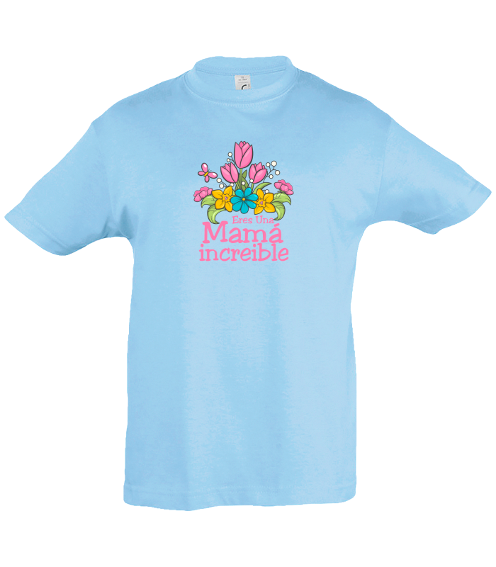 Camiseta de manga corta para niño/a con cuello redondo reforzado con diseño de mamá increíble.