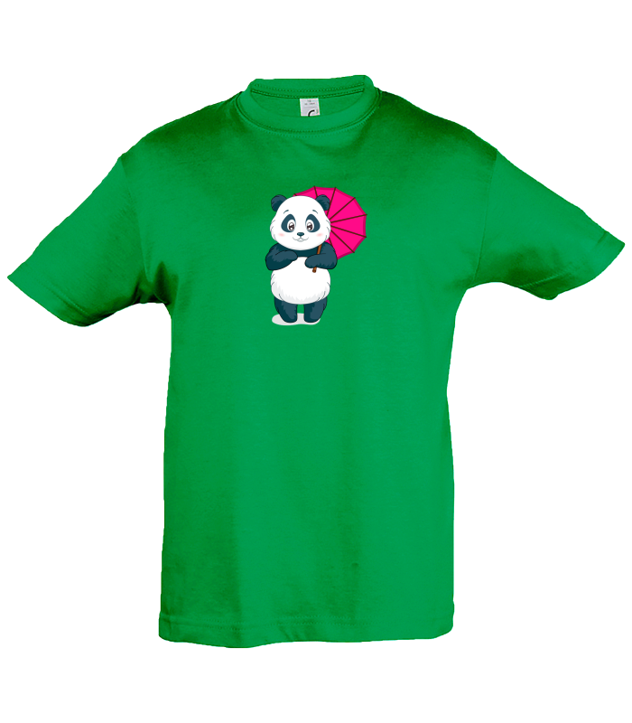 Camiseta de manga corta para niño/a con cuello redondo reforzado con diseño de panda paraguas.