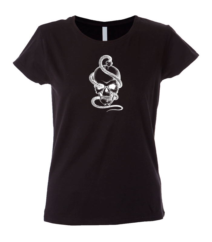 Camiseta mujer de manga corta con cinta de refuerzo en el cuello con diseño de calavera serpientes