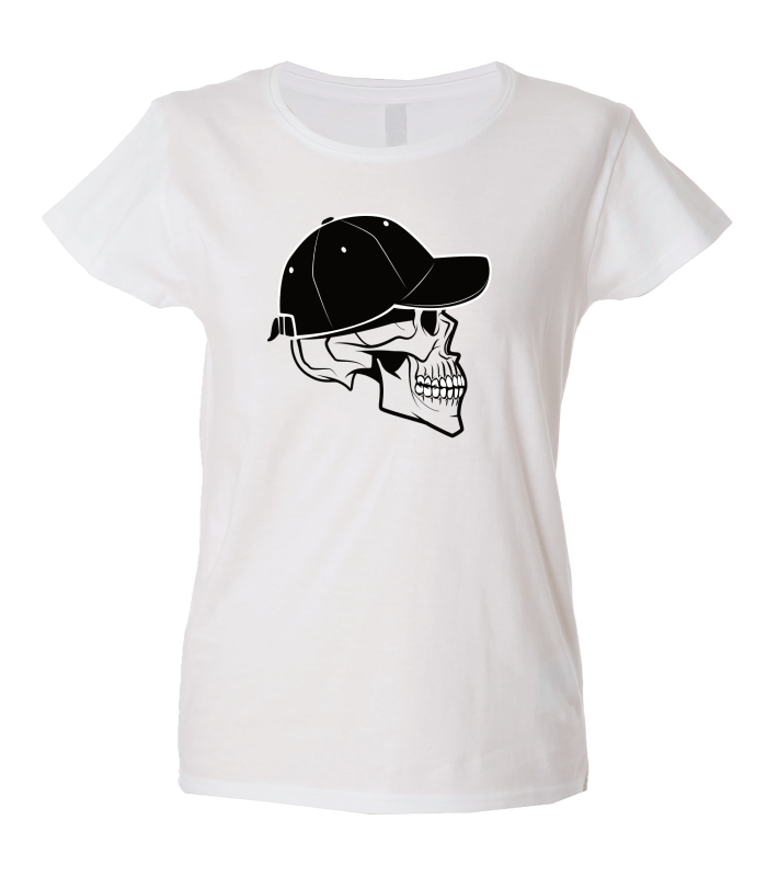 Camiseta mujer de manga corta con cinta de refuerzo en el cuello con diseño de calavera gorra