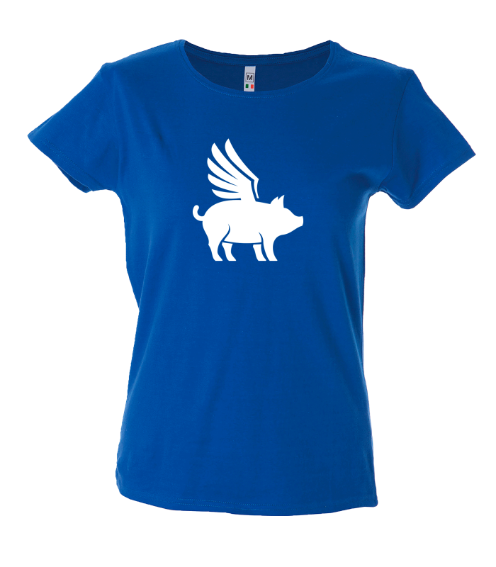 Camiseta mujer de manga corta con cinta de refuerzo en el cuello con diseño de cerdo volador.