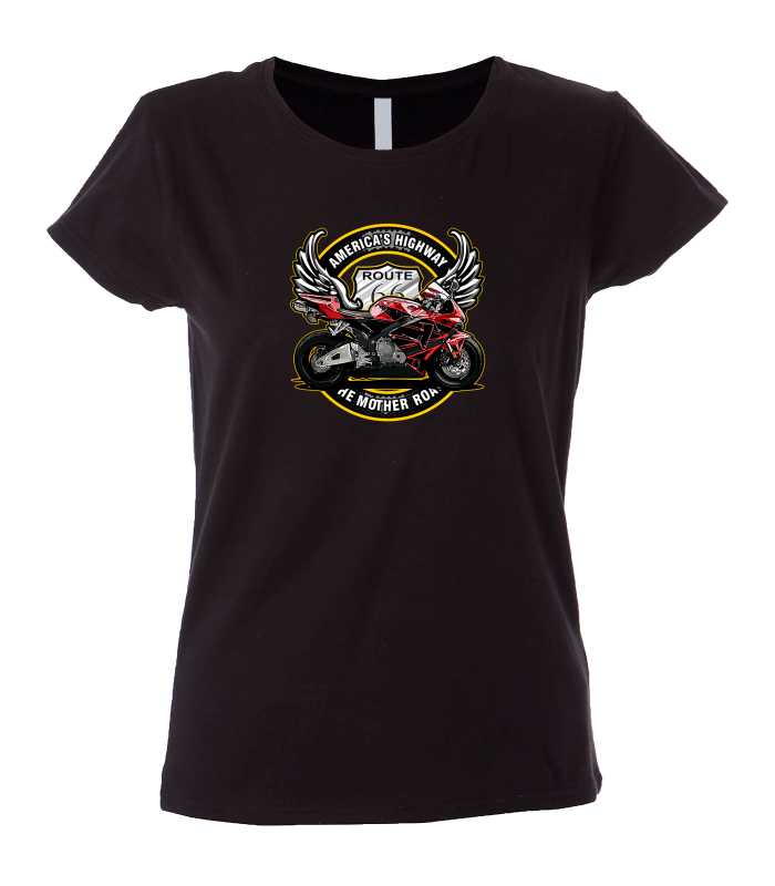 Camiseta mujer de manga corta con cinta de refuerzo en el cuello con diseño de ruta 66