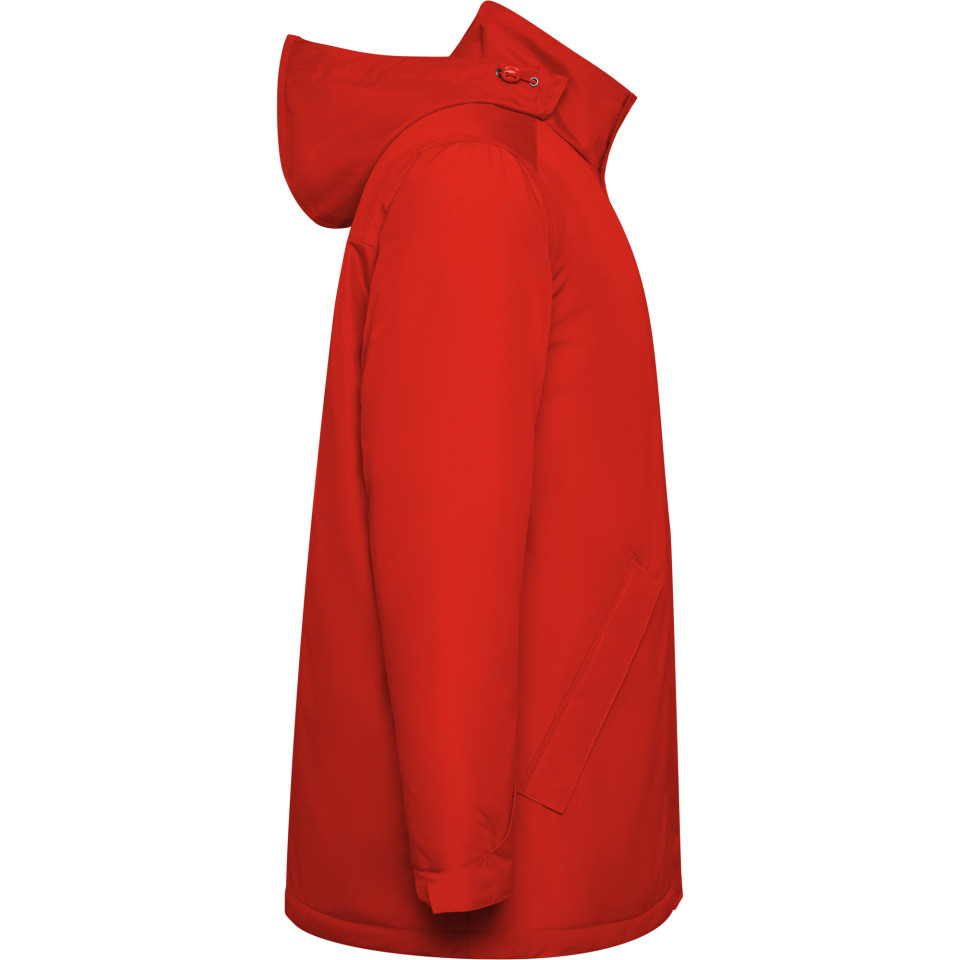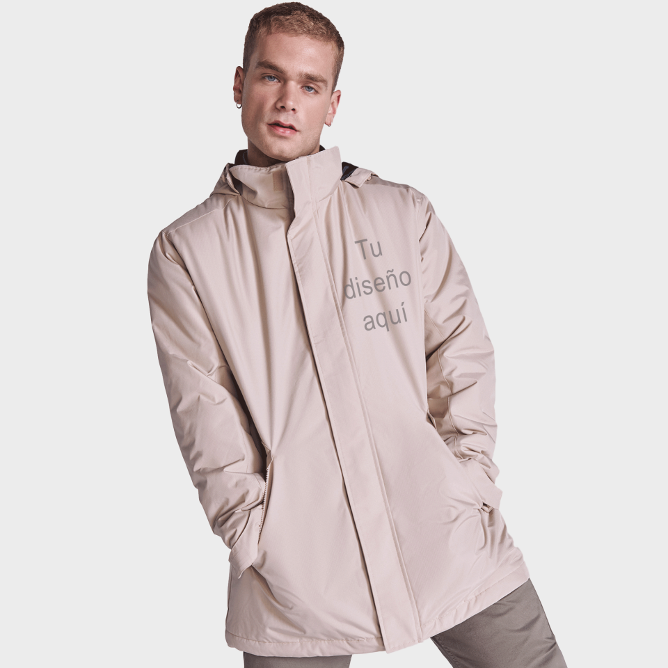 Parka acolchada de tejido impermeable a prueba de viento. Cuello alto con capucha plegable y cierre de velcro