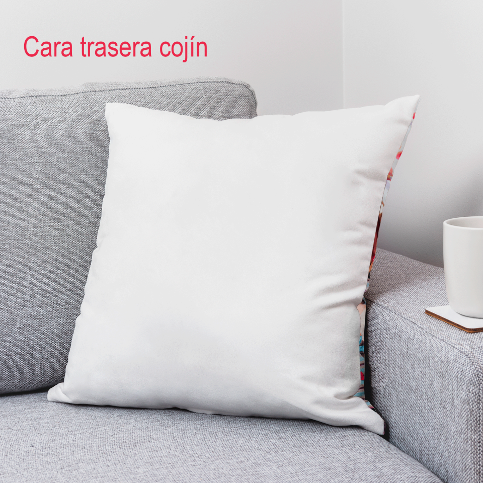 En este modelo, puede personalizarse la cara delantera del cojín 100% full print y la trasera será de color blanco o negro.
