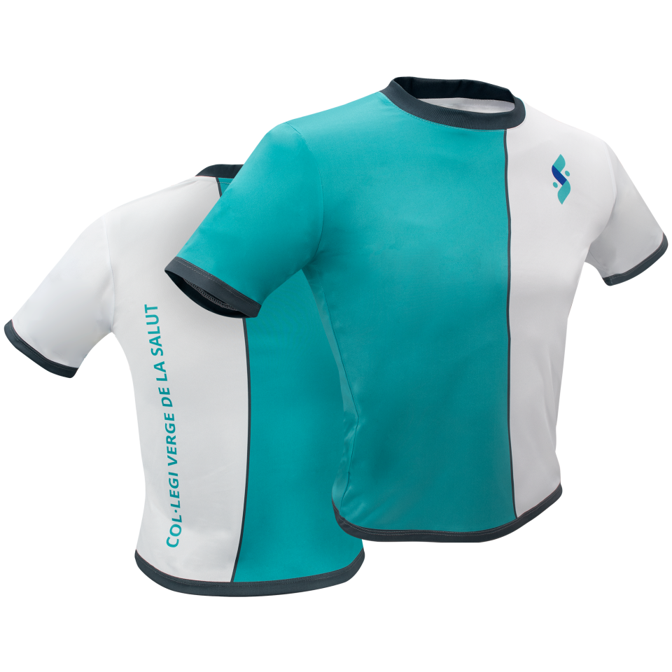 Porta sublimat en el pit el logotip i el nom de l'escola a l'esquena