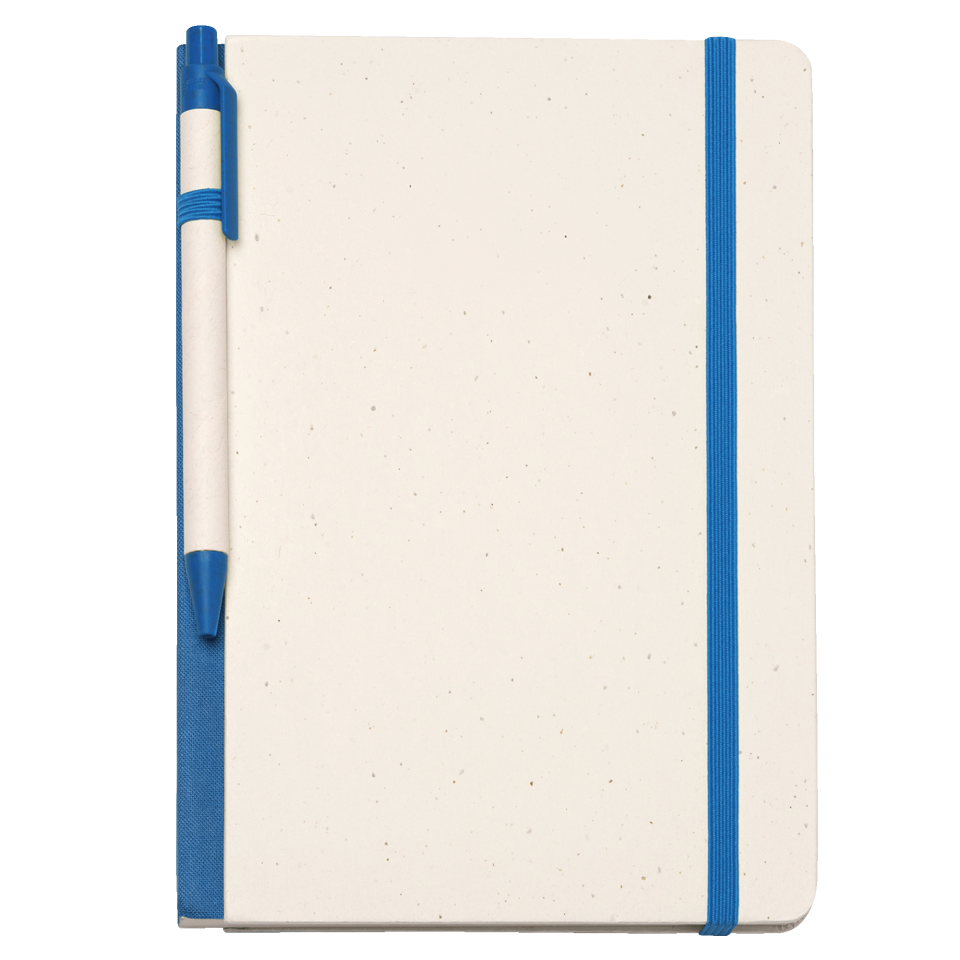 En la tapa cuenta con una banda elástica y un marca páginas, ambos a juego con el bolígrafo de tinta azul que viene incluido