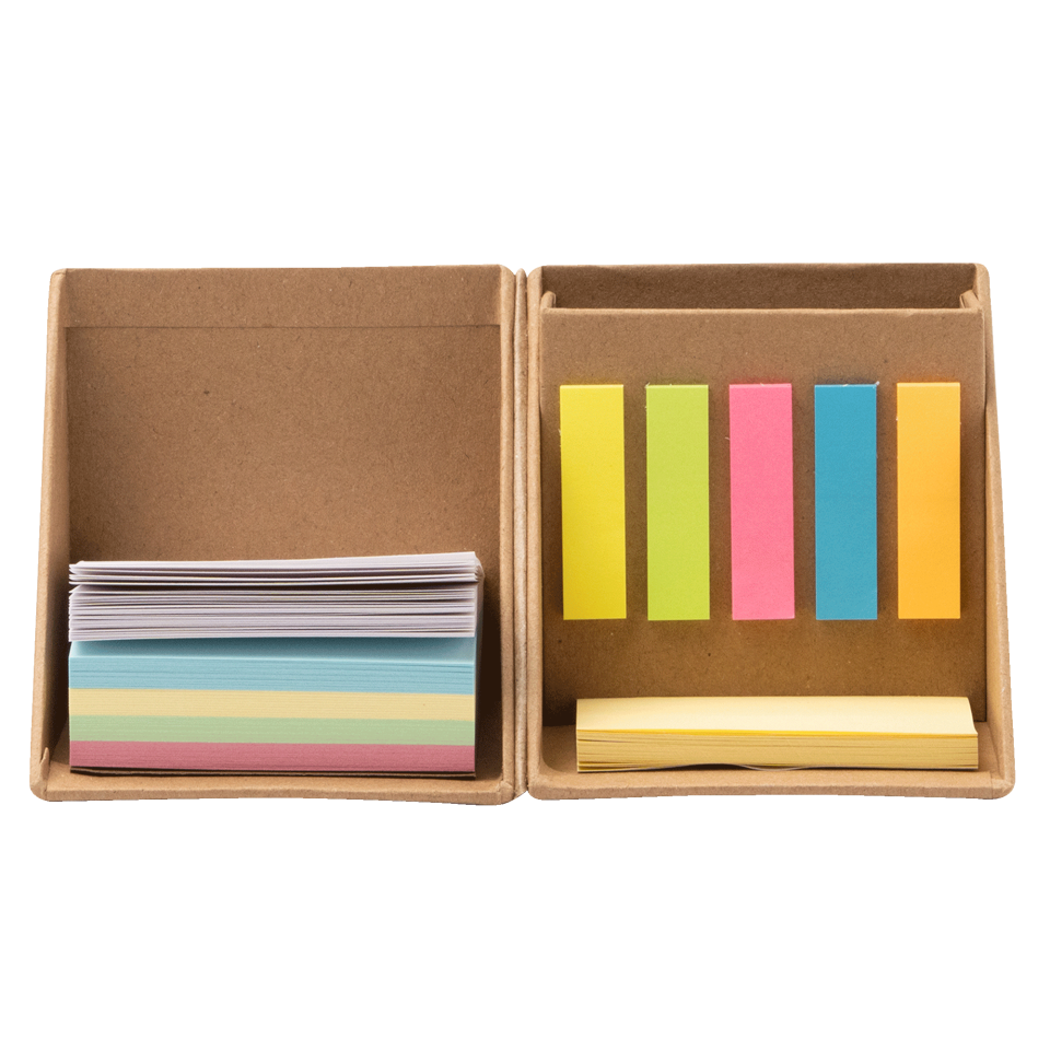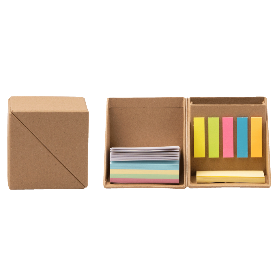 Set de escritorio de cartón en forma de cubo compuesto por lapicero, bloc de notas (250 hojas) y 180 notas adhesivas en varios colores