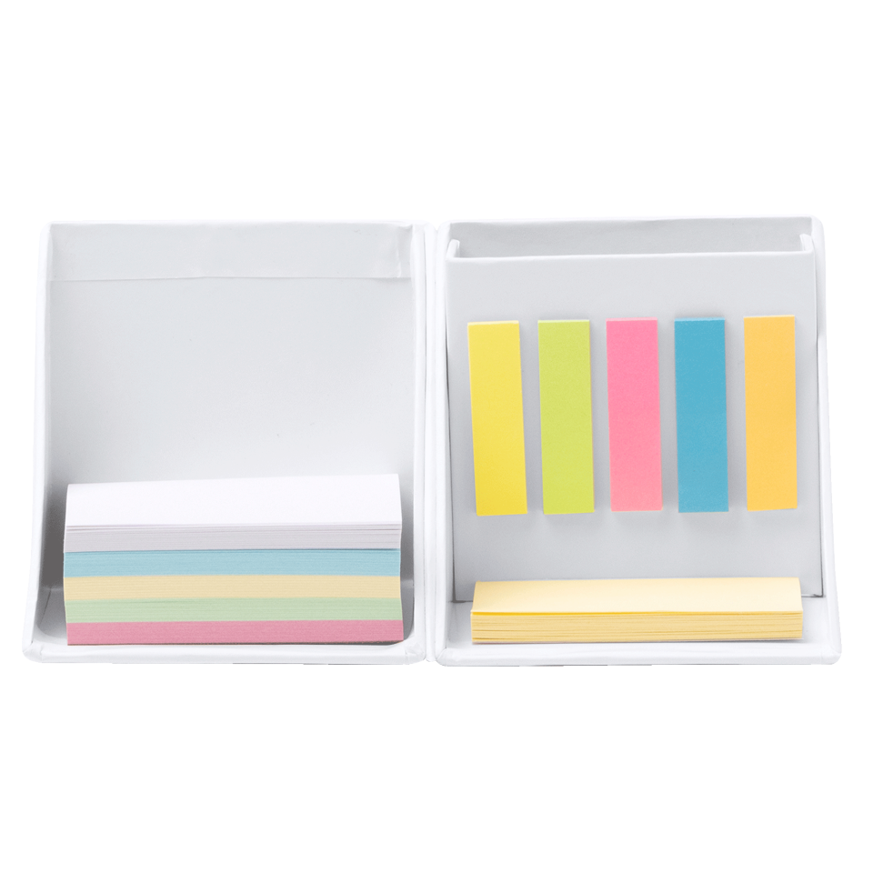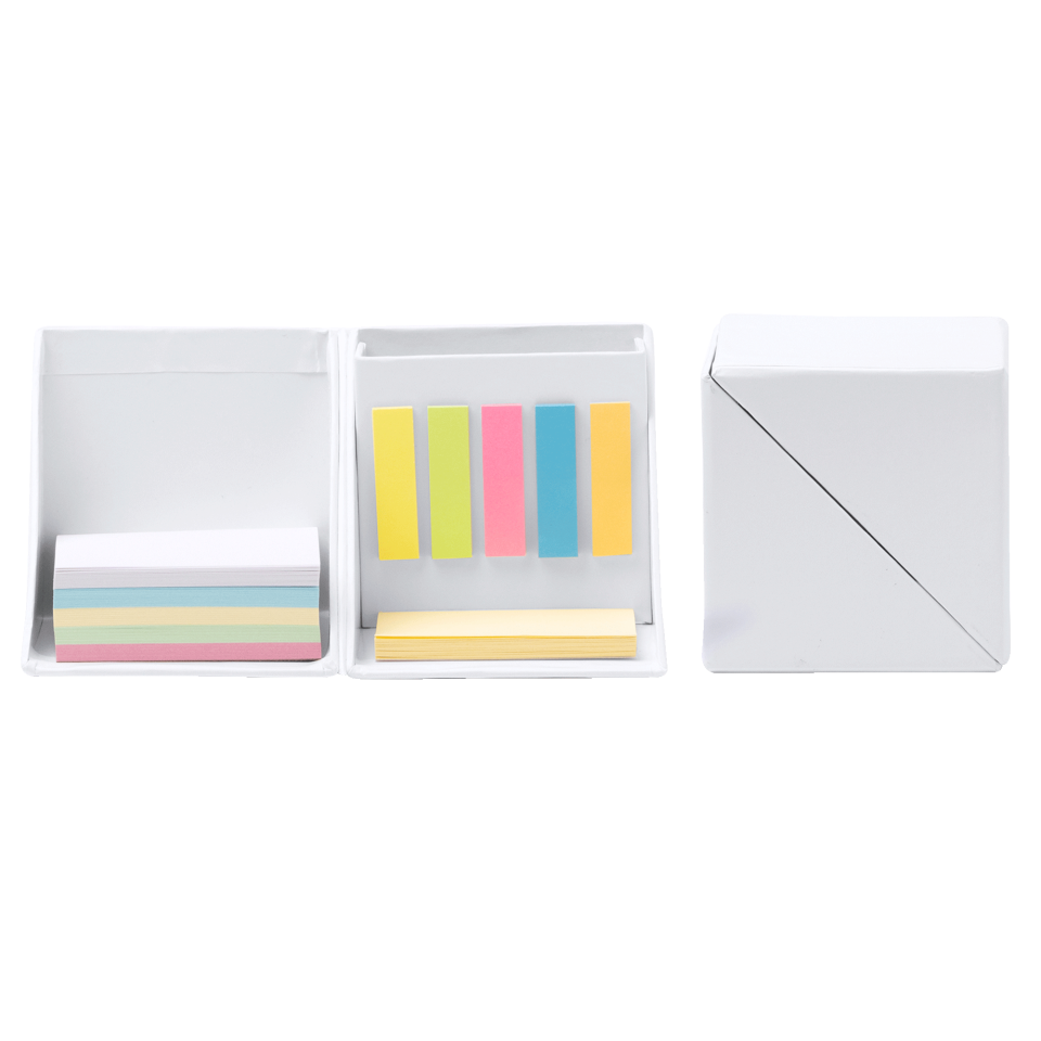 Set de escritorio de cartón en forma de cubo compuesto por lapicero, bloc de notas (250 hojas) y 180 notas adhesivas en varios colores