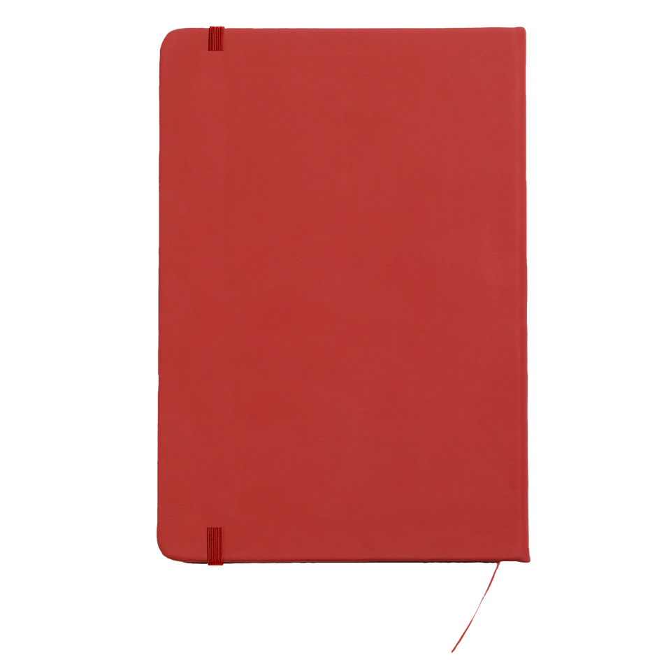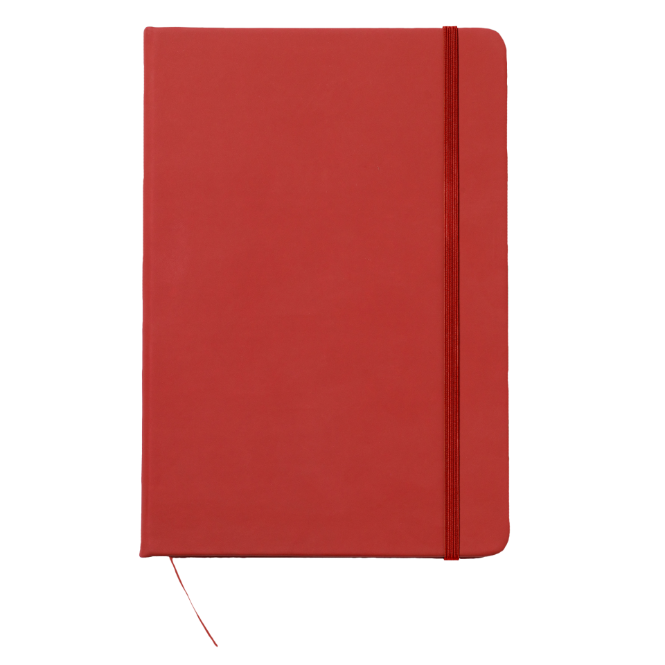 Libreta A5 con tapa rígida de polipiel con marca páginas y banda elástica.