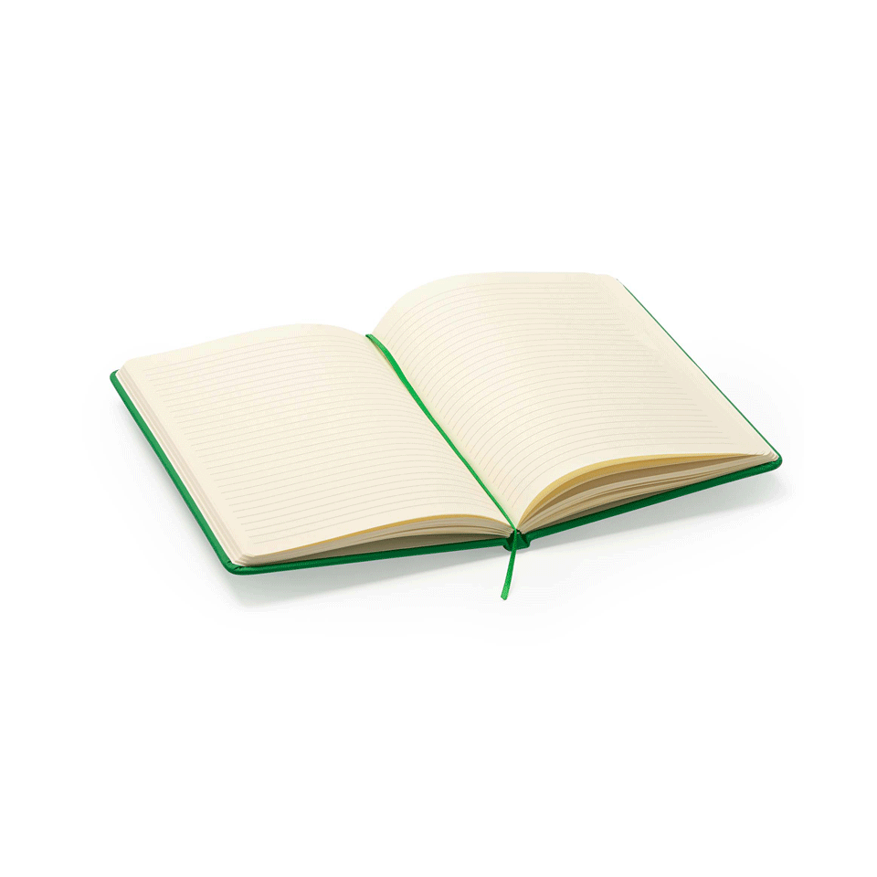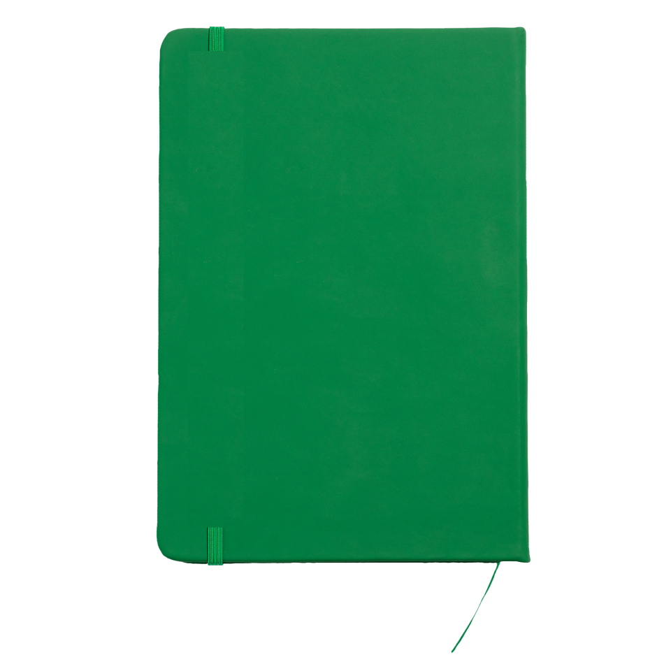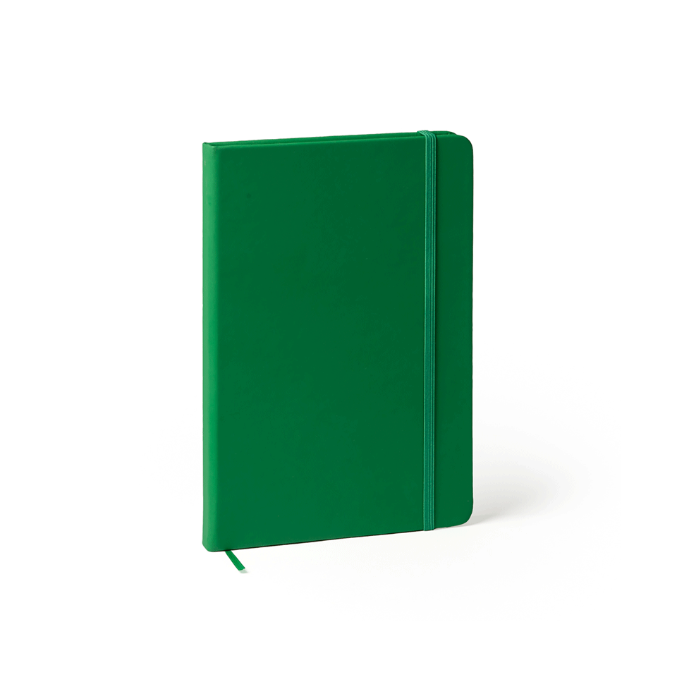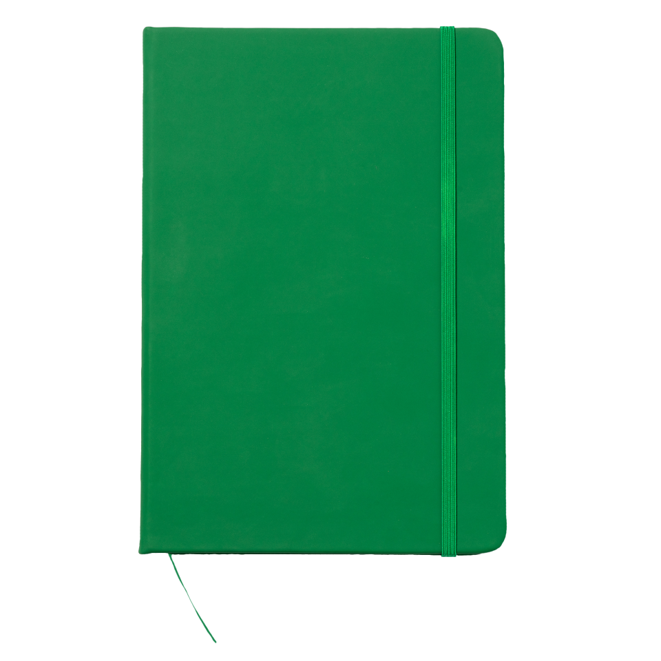 Libreta A5 con tapa rígida de polipiel con marca páginas y banda elástica.
