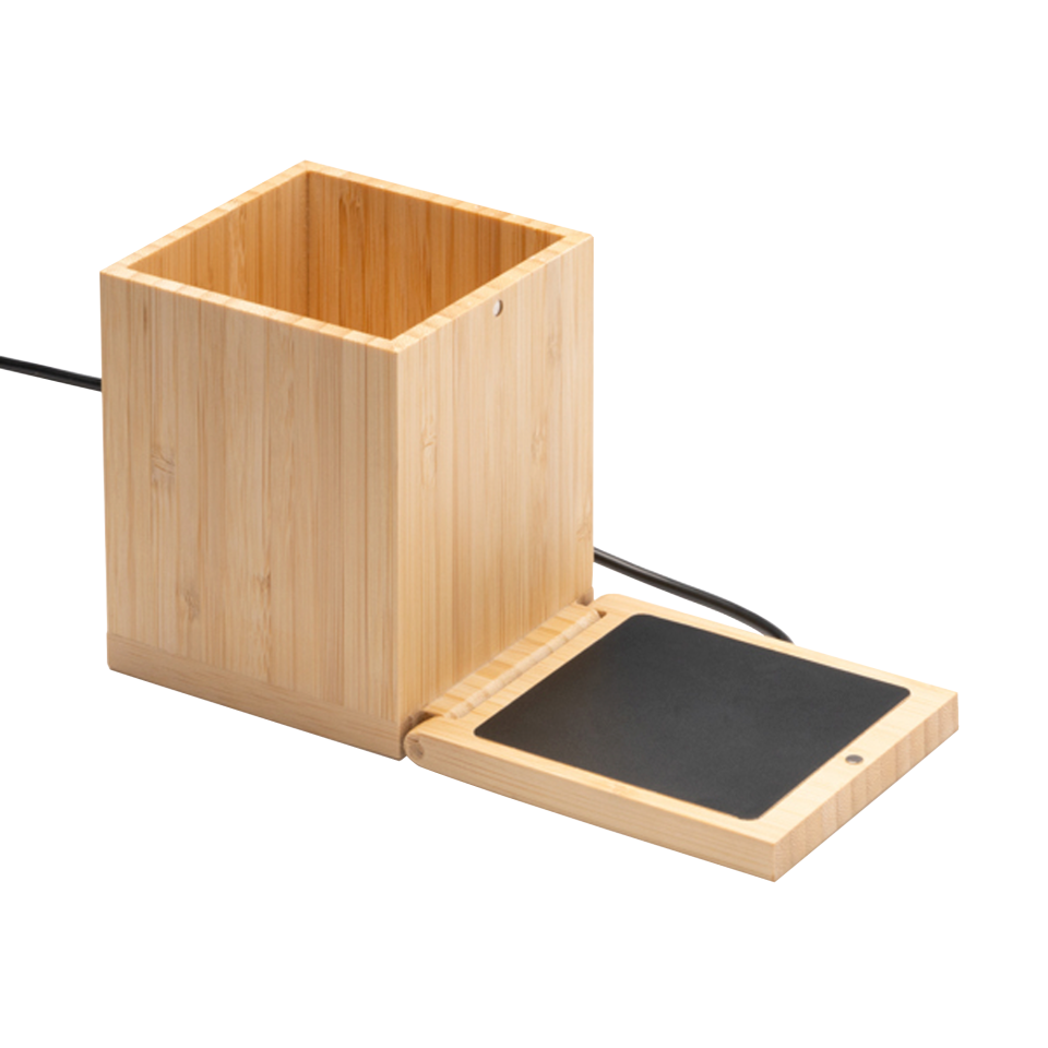 Portalápices con calentador de tazas, realizado en cuerpo de bambú. Perfecto para mantener la bebida caliente.