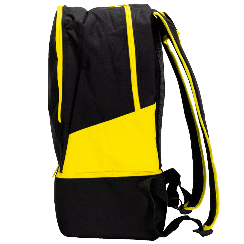 Cuenta con un compartimento principal con cierre de cremallera. Incorpora otro bolsillo frontal de mejor capacidad. En la parte de abajo, tiene un zapatillero (14 cm de alto), reforzado con tejido resistente. Por otro lado, incluye dos bolsillos laterales de rejilla con cierre elástico.