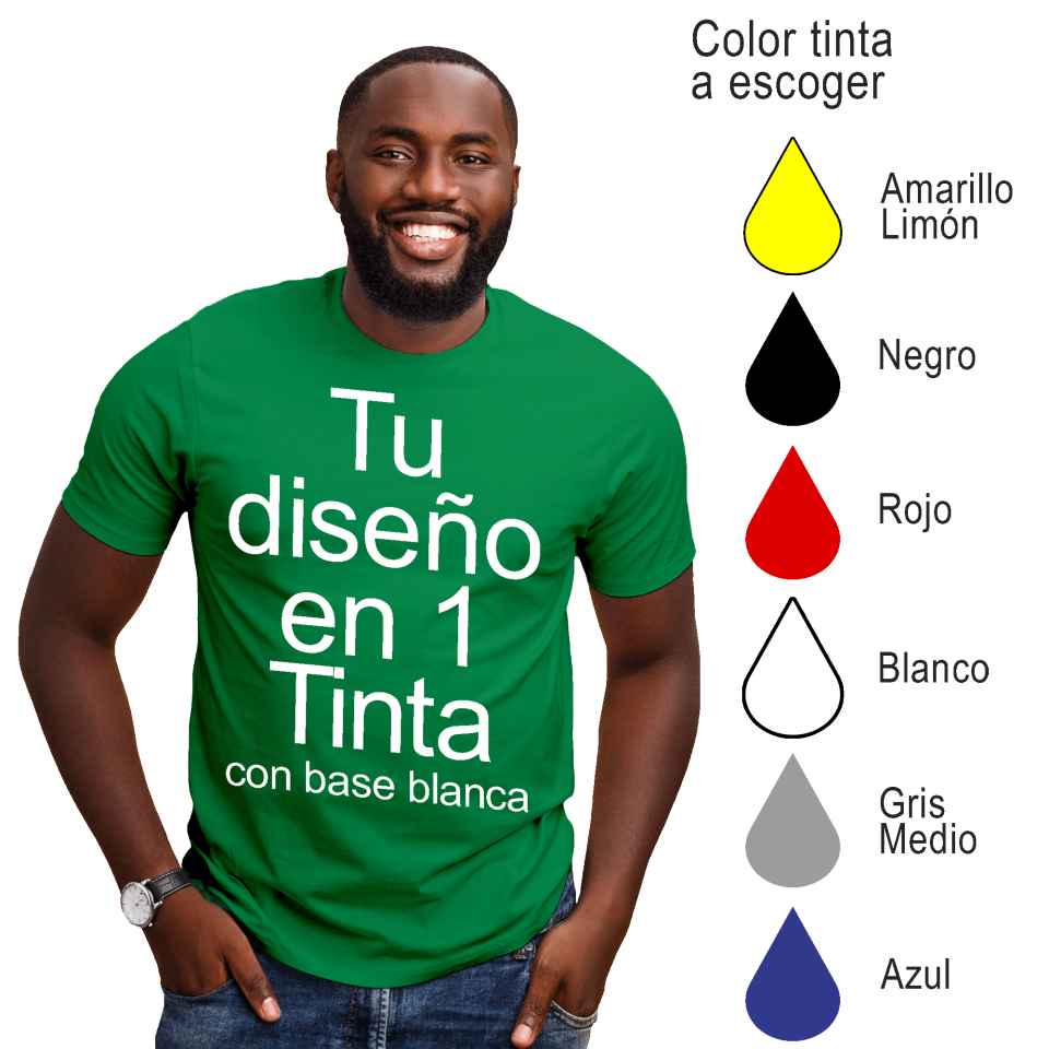 También deberás indicarnos el color de la tinta en la que quieras personalizar tu camiseta, las colores disponibles son los siguientes: blanco, negro, rojo, amarillo limón, gris medio y azul.