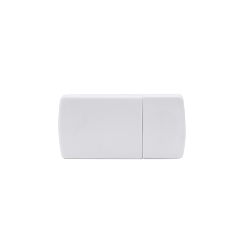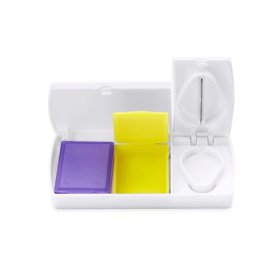 Pastillero con dos secciones: una con dos cajitas de dos colores y otr con un cortador para partir comprimidos de mayor volumen.