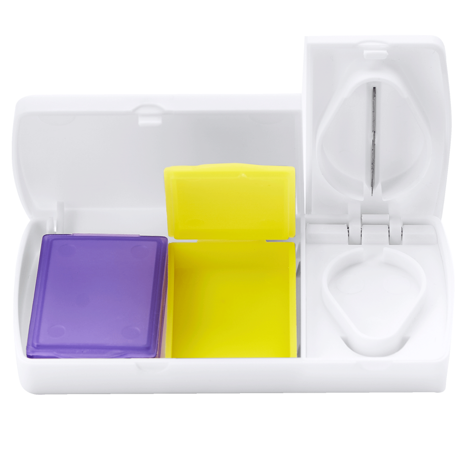 Pastillero con dos secciones: una con dos cajitas de dos colores y otro con un cortador para partir comprimidos de mayor volumen.