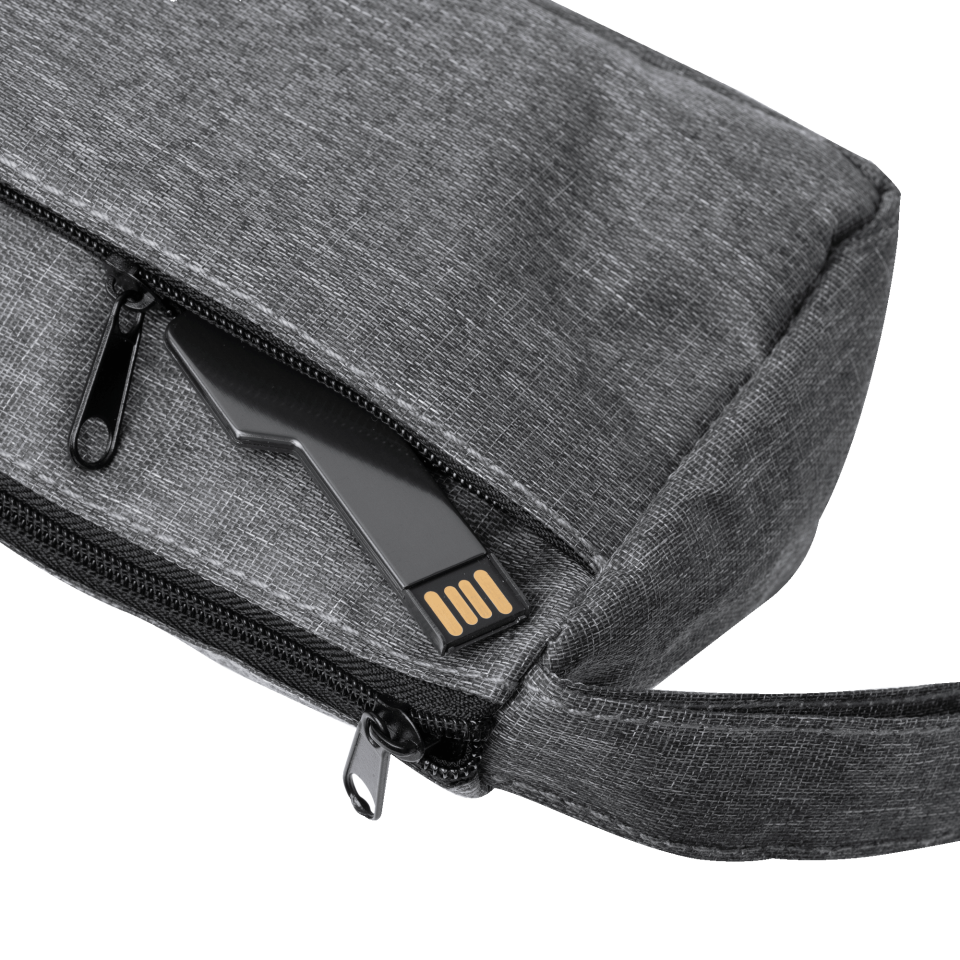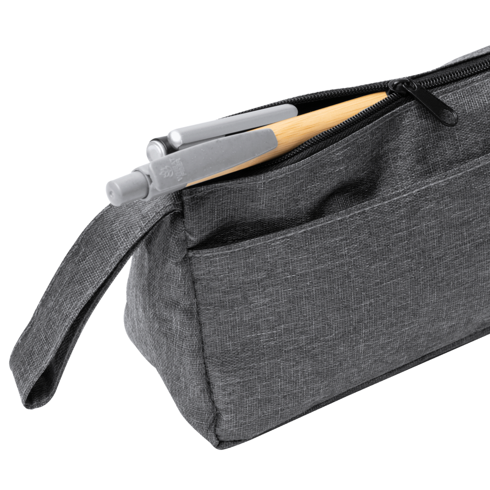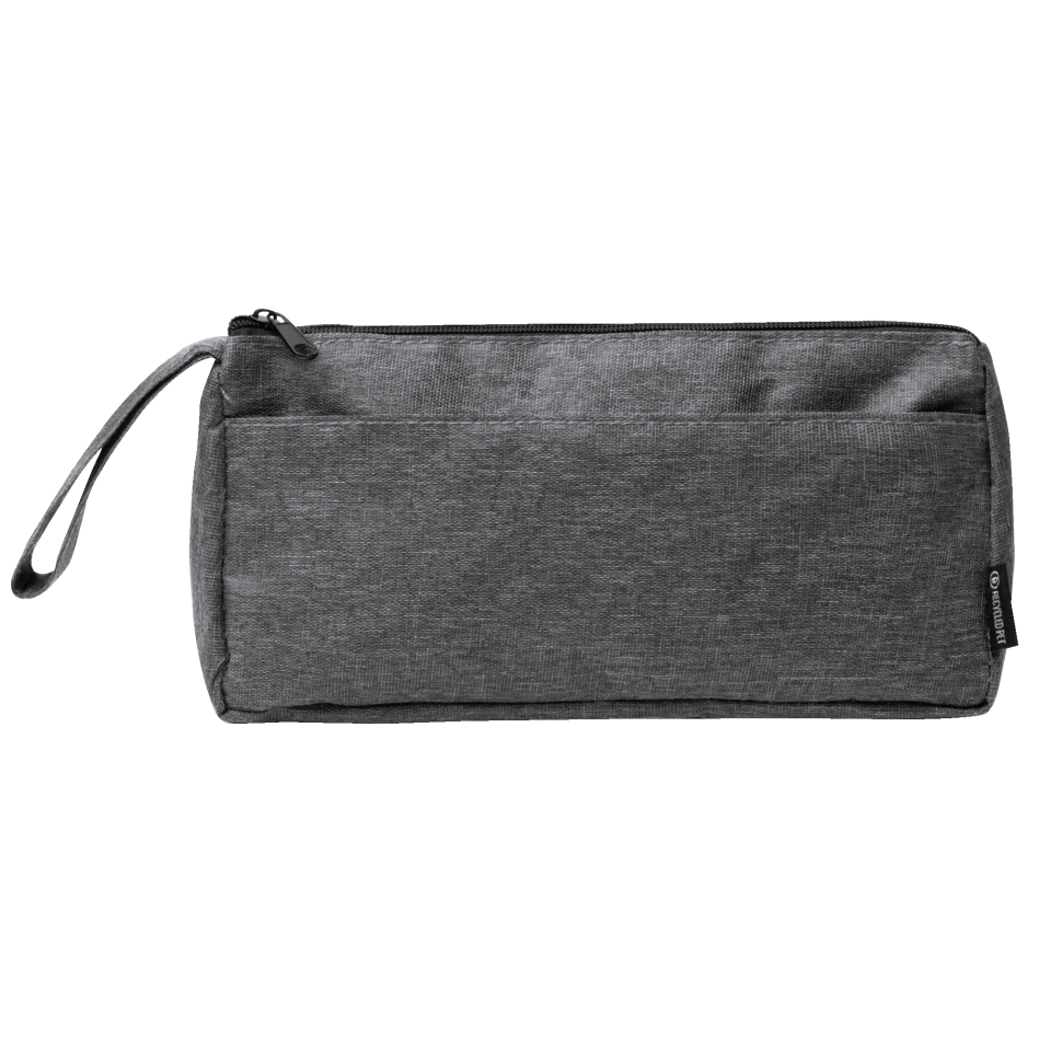 Estuche realizado en 300D RPET con diseño vigoré, cuenta con un compartimento principal con cierre de cremallera y un bolsillo exterior de menor tamaño.
