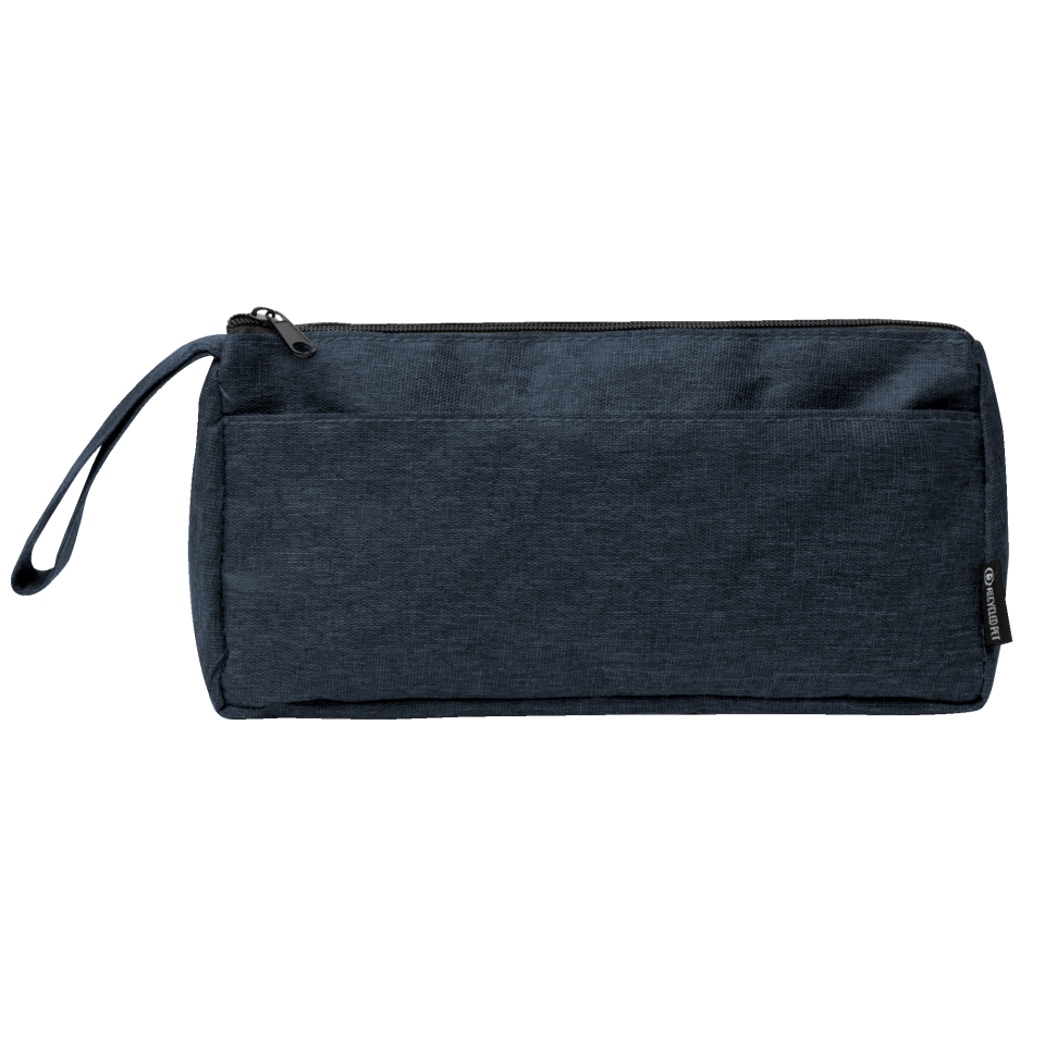 Estuche realizado en 300D RPET con diseño vigoré, cuenta con un compartimento principal con cierre de cremallera y un bolsillo exterior de menor tamaño.