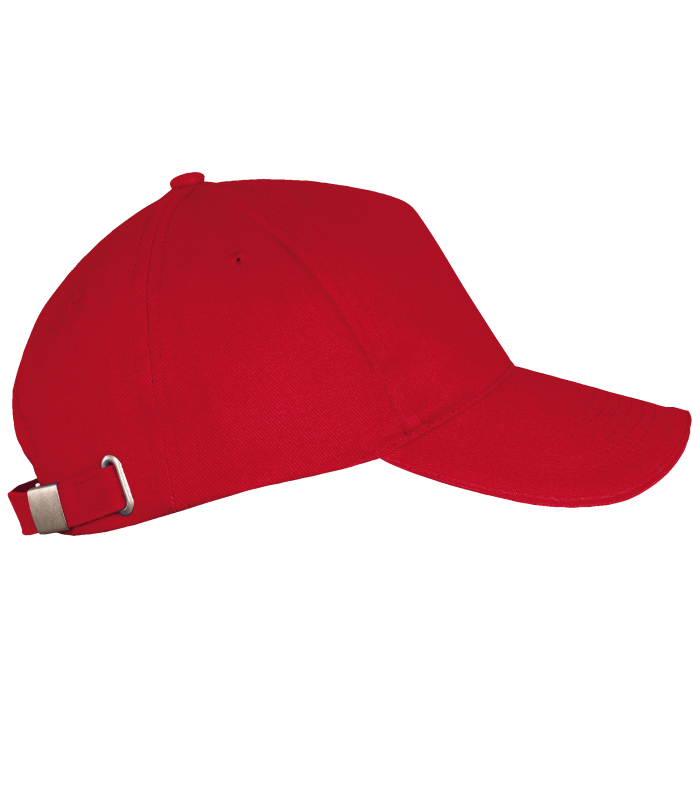Gorra de 5 paneles con cierre trasero regulable con una hebilla metálica; 100% algodón perchado espeso.