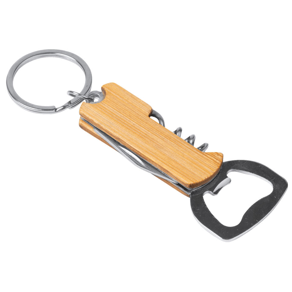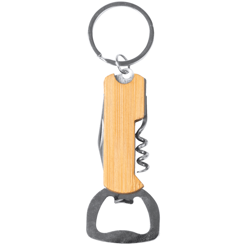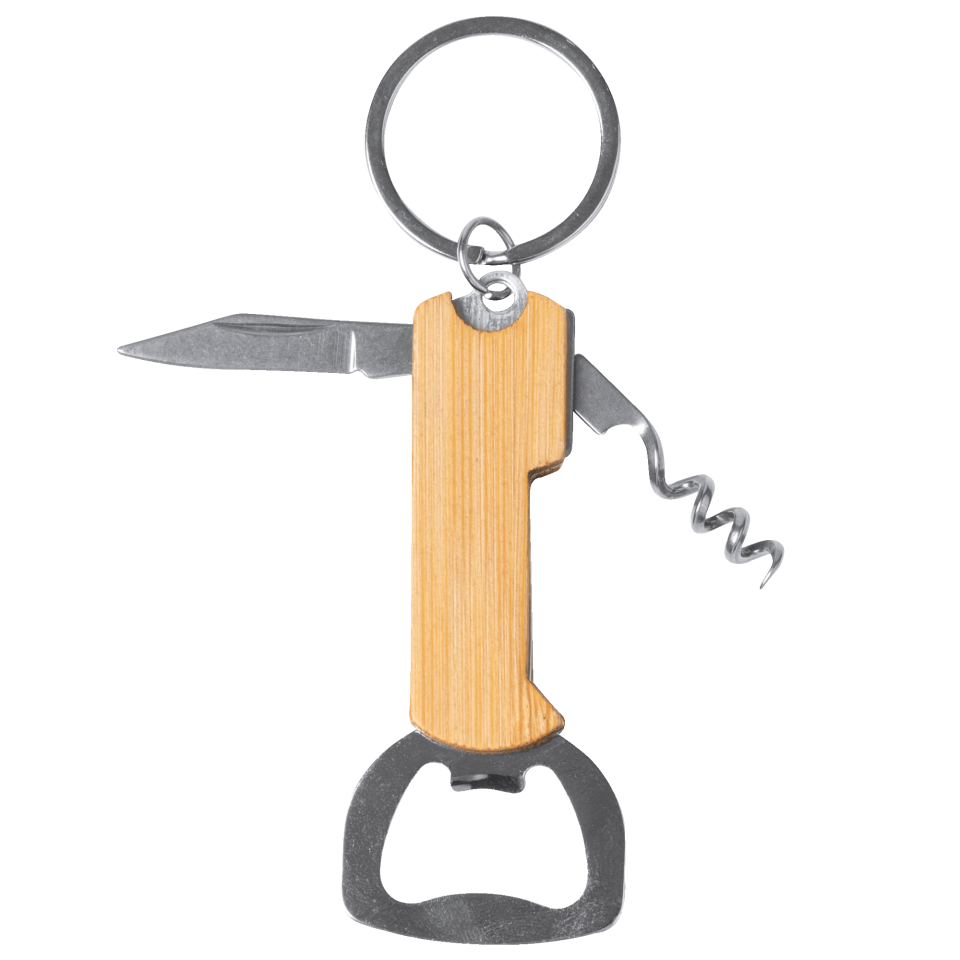 Llavero abridor con navaja y sacacorchos con cuerpo de bambú