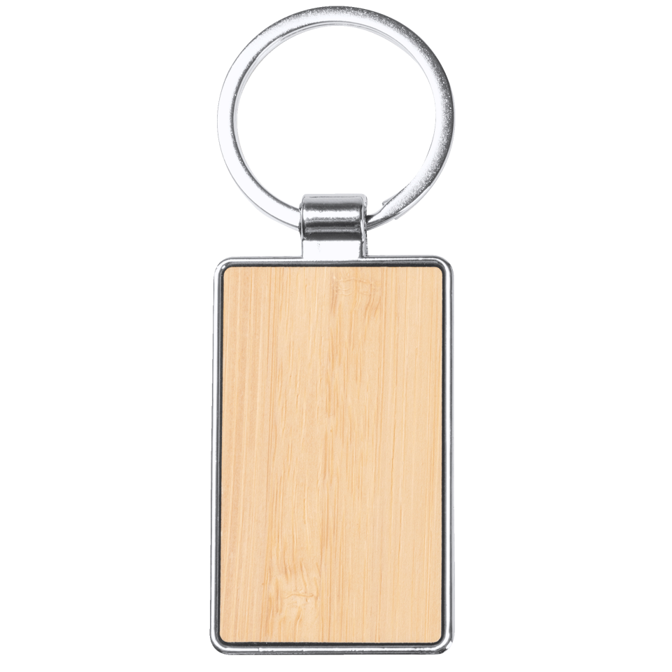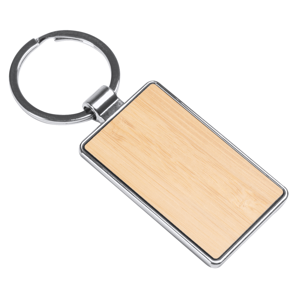 Llavero con diseño rectangular elaborado en bambú con acabado metálico