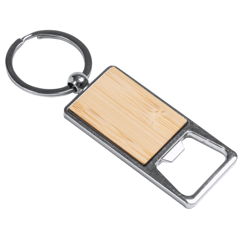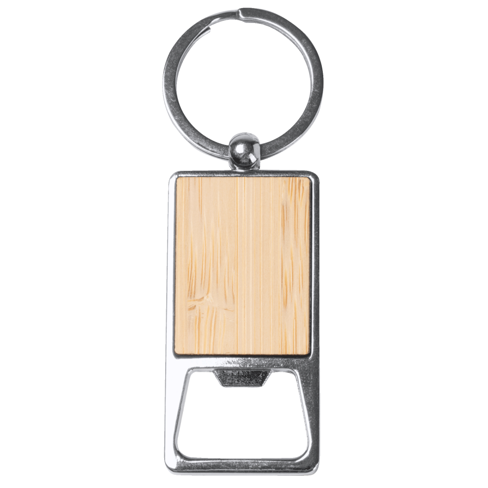 Llavero abridor con diseño rectangular, acabado cromado y superficie de bambú