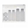 Neceser de viaje transparente con 6 envases vacíos.
