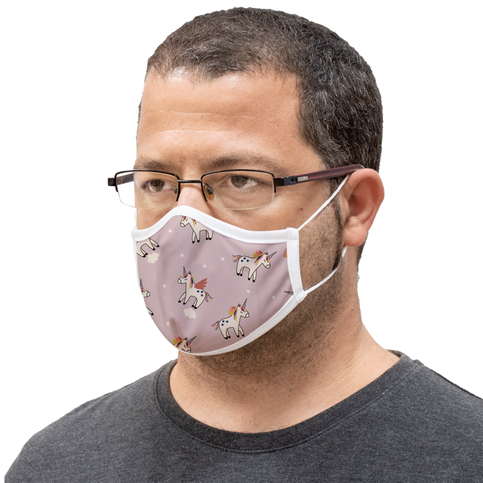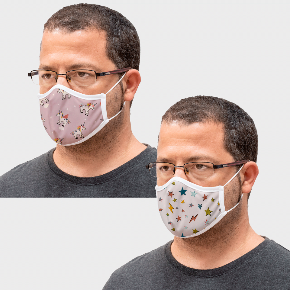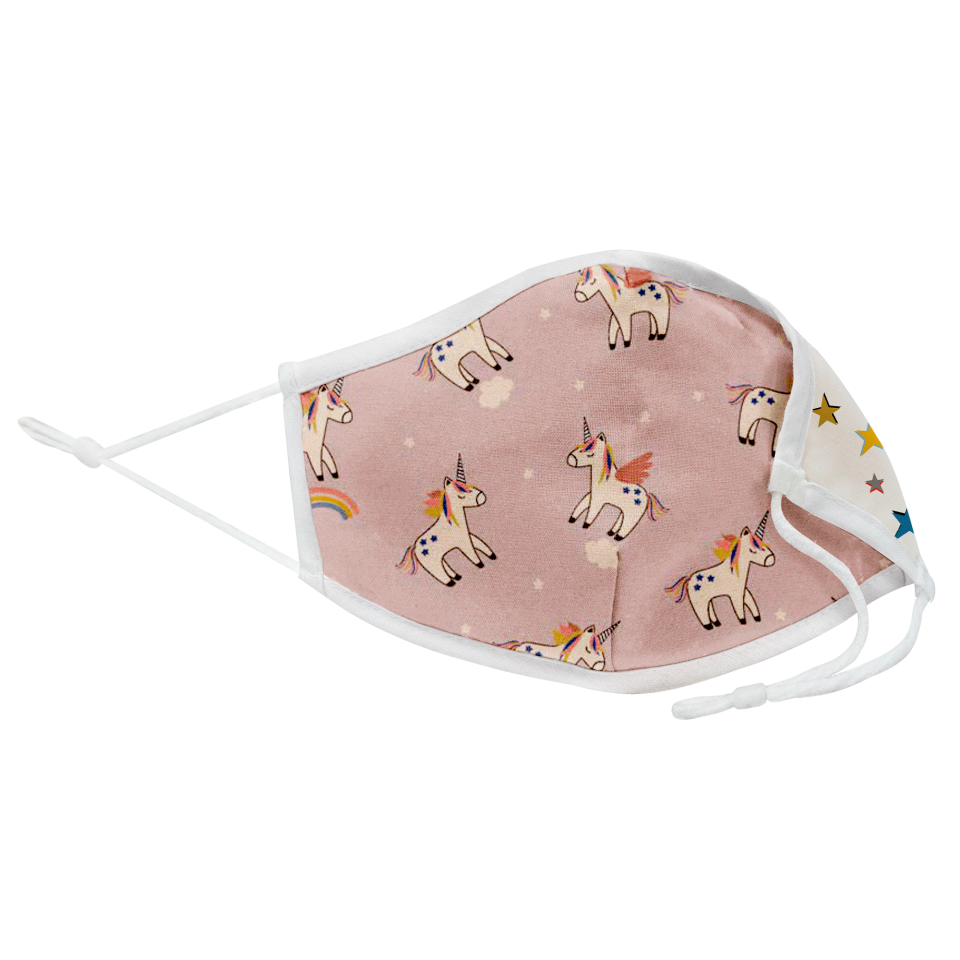 Ver másVer menosMascarilla algodón orgánico reversible grande unicorn pink y star homologada con protección +90%