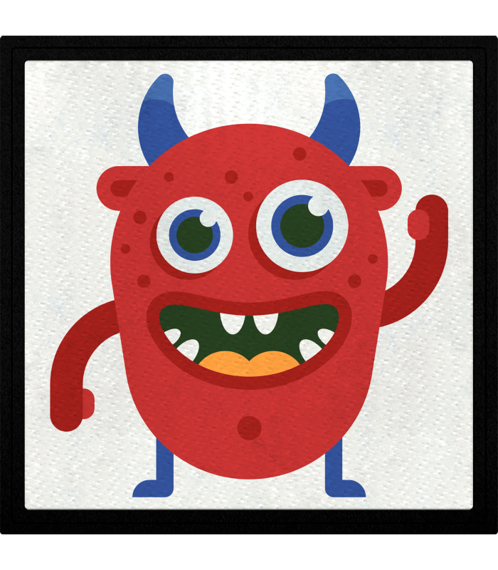 Parche stick DTF Eco flock negro con diseño de monstruo rojo.