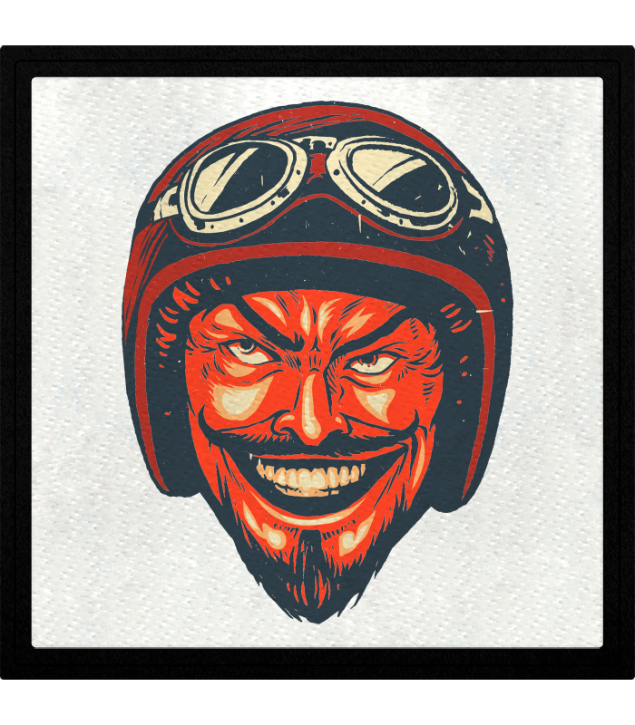 Parche stick DTF Eco flock negro con diseño de motero malvado.