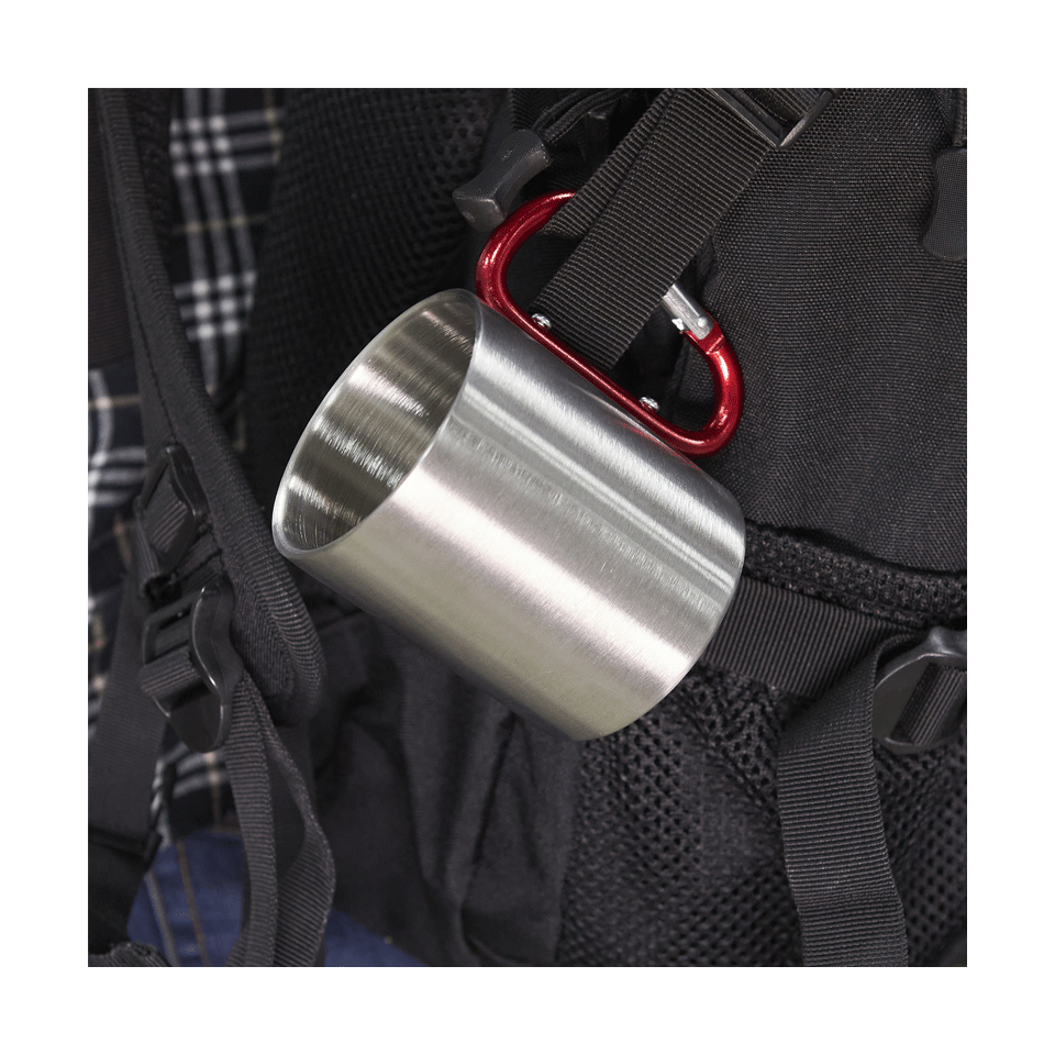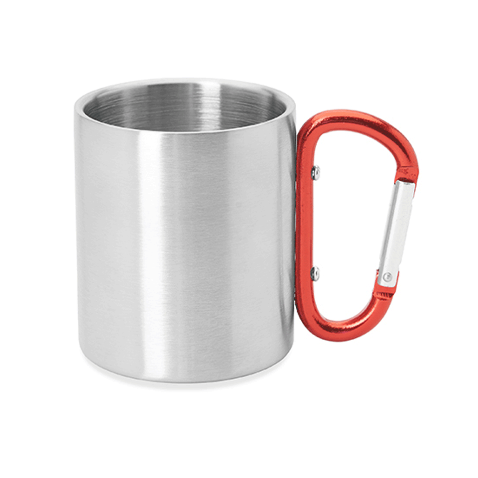 Taza metálica de doble pared con asa mosquetón disponible en varios colores.