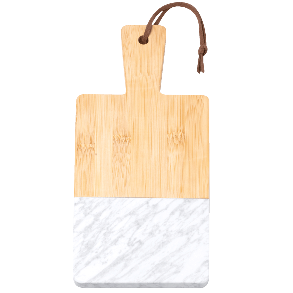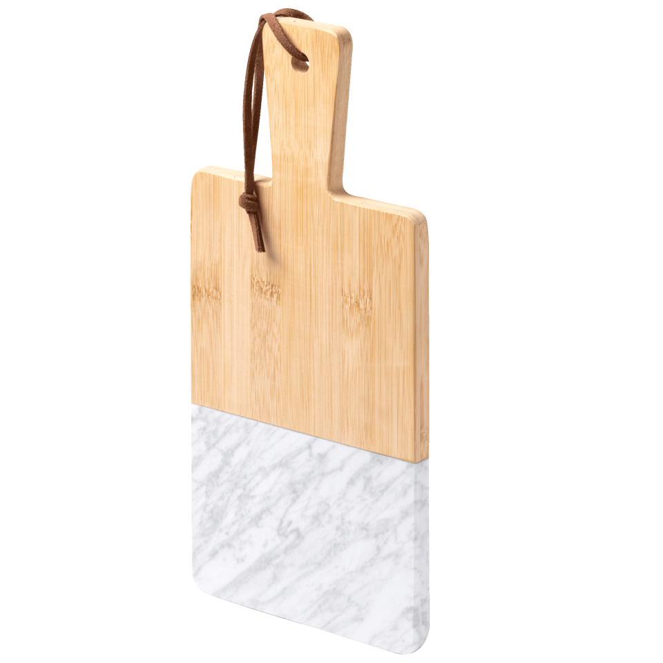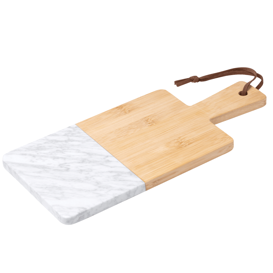 Tabla realizada en bambú y mármol natural e incluye una cinta de transporte en polipiel